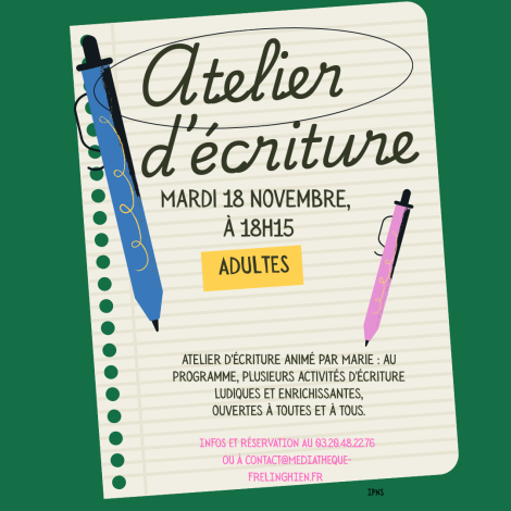 Venez nous rejoindre pour participer à notre atelier d'écriture animé par Marie : au programme, plusieurs activités d'écriture enrichissantes.